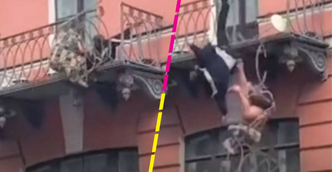 De acuerdo con medios locales esto ocurrió en la ciudad de San Petersburgo, en Rusia. La grabación de apenas ocho segundos de duración nos permite ver que un hombre y una mujer discuten y se agarran a golpes en un balcón que se encuentra en el segundo piso de una construcción, el cual por cierto no se ve en buen estado.