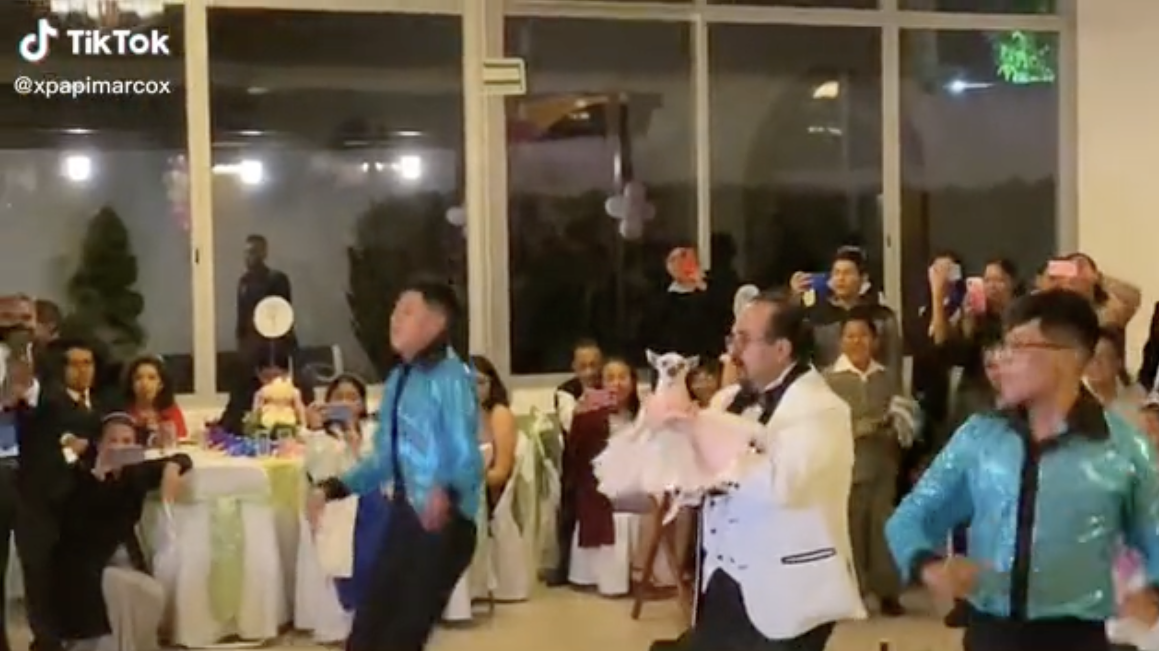 No es broma. Un usuario llamado Marco Valencia compartió un clip donde se puede ver cómo una pequeña chihuahua, con todo y vestido pomposo, baila en compañía de sus chambelanes. Todo esto mientras la carga el que parece ser su dueño.