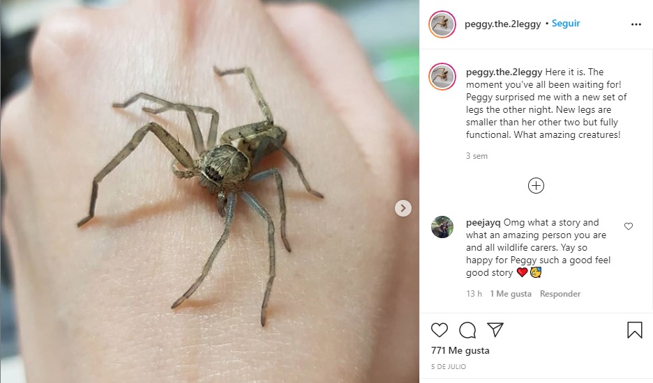 Ha pasado un mes desde entonces y la labor de Walsh, comenzó a dar frutos. Las seis patas faltantes de la araña, han comenzado a crecer nuevamente. Pero, Walsh la sigue alimentando con pequeños insectos a través de unas pinzas. La intención es que ‘Peggy’, recupere fuerza y vuelva a desarrollar su instinto de caza.
