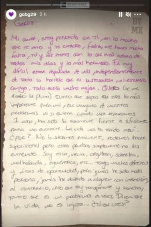 La carta en cuestión fue escrita por YosStop para su novio, Gerardo Gonzáles, quien publicó en sus historias de Instagram una foto en la que Yoseline ‘H’ le dice que lo extraña junto a sus perritos: “Me haces mucha falta. Tú y los nenes son lo que más adoro de todos mis días y lo más hermoso. Es muy difícil estar separada de ustedes, independientemente de todo lo horrible que es la situación”, dice la youtuber.