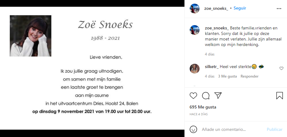 En la cuenta de Instagram de Zoe Snoeks se ve que efectivamente era una mujer a quien le encantaba ir de viaje y en cada uno se tomaba una selfie. Su último post es un memorial donde “se despide” de todos (me-ga cha-le).