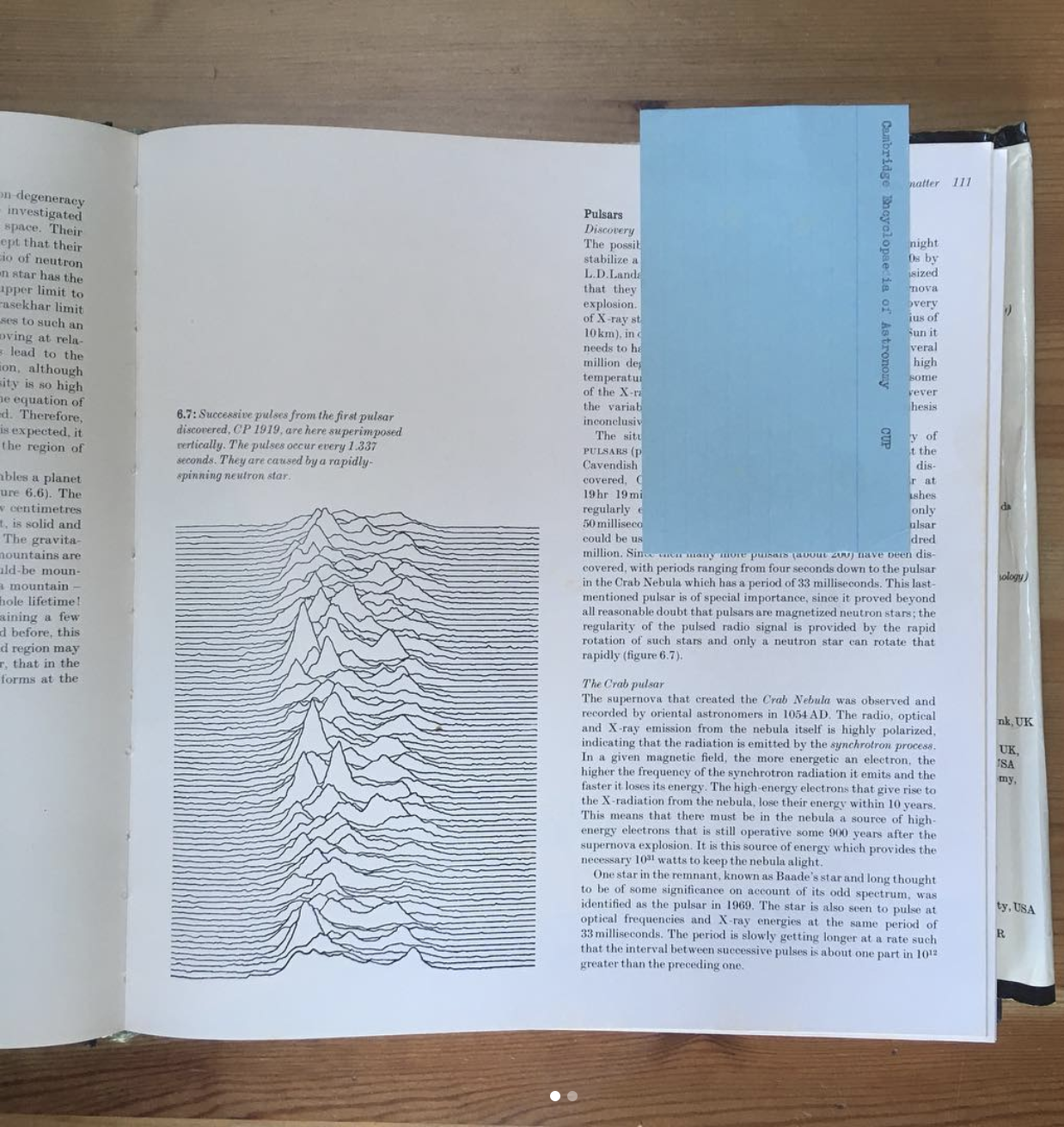 No mucho tiempo después, se descubrió que la imagen es un diagrama apilado de las emisiones de radio emitidas por un púlsar, es decir, una estrella de neutrones giratoria. Originalmente llamado CP 1919, el púlsar específico de esta portada, fue el primero en ser descubierto en 1967 por la estudiante Jocelyn Bell Burnell y su supervisor Antony Hewish de la Universidad de Cambridge.