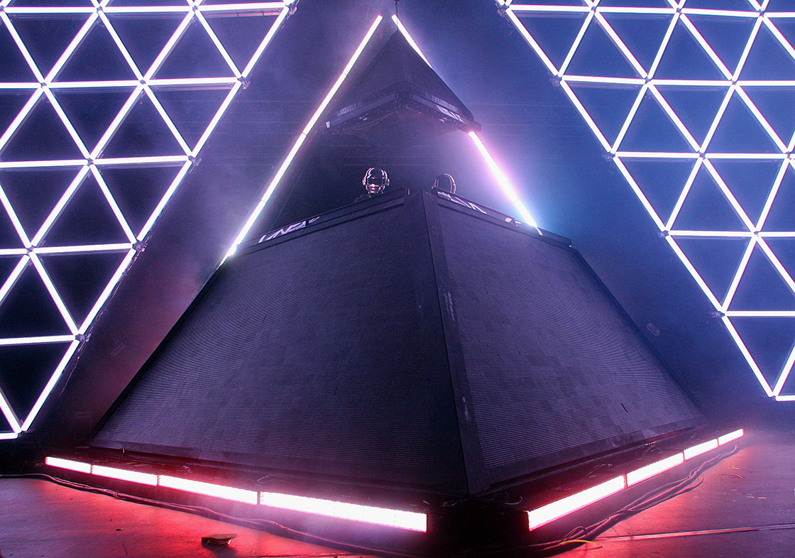 Lo que caracterizaba estas presentaciones era el escenario, pues tenía una estructura metálica compleja con formas triangulares y además, cada pieza tenía luz propia. El centro por otra parte, era un podio triangular donde se colocaba Daft Punk y mientras realizaba su performance, detrás de ellos había una enorme pantalla de proyección y otras pantallas LED.