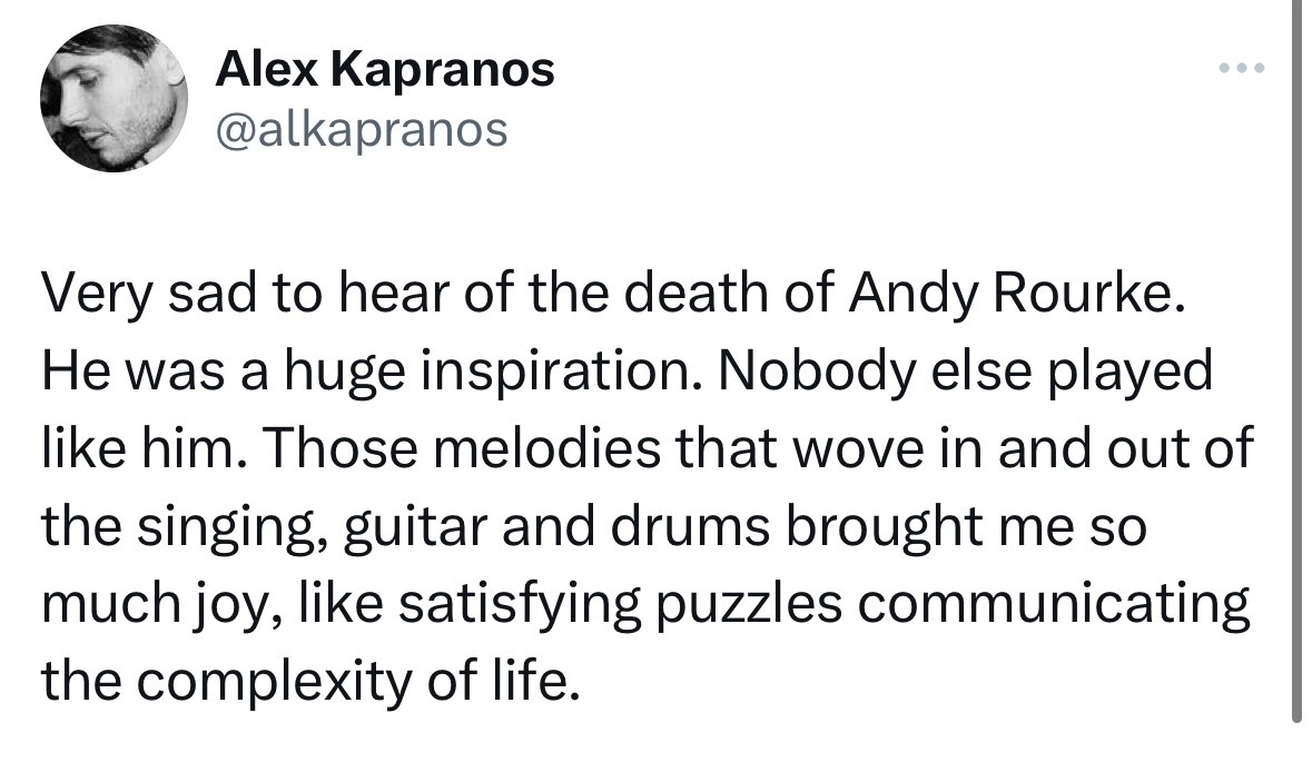 Alex Kapranos también se unió a los tributos para Andy Rourke, junto al cantante de Belle and Sebastian, Stuart Murdoch, que llamó al exintegrante de The Smiths una “leyenda”. Por su parte, el frontman de Travis, Fran Healy, lo secundó, declaró que el bajista un “alma amable y encantadora”.