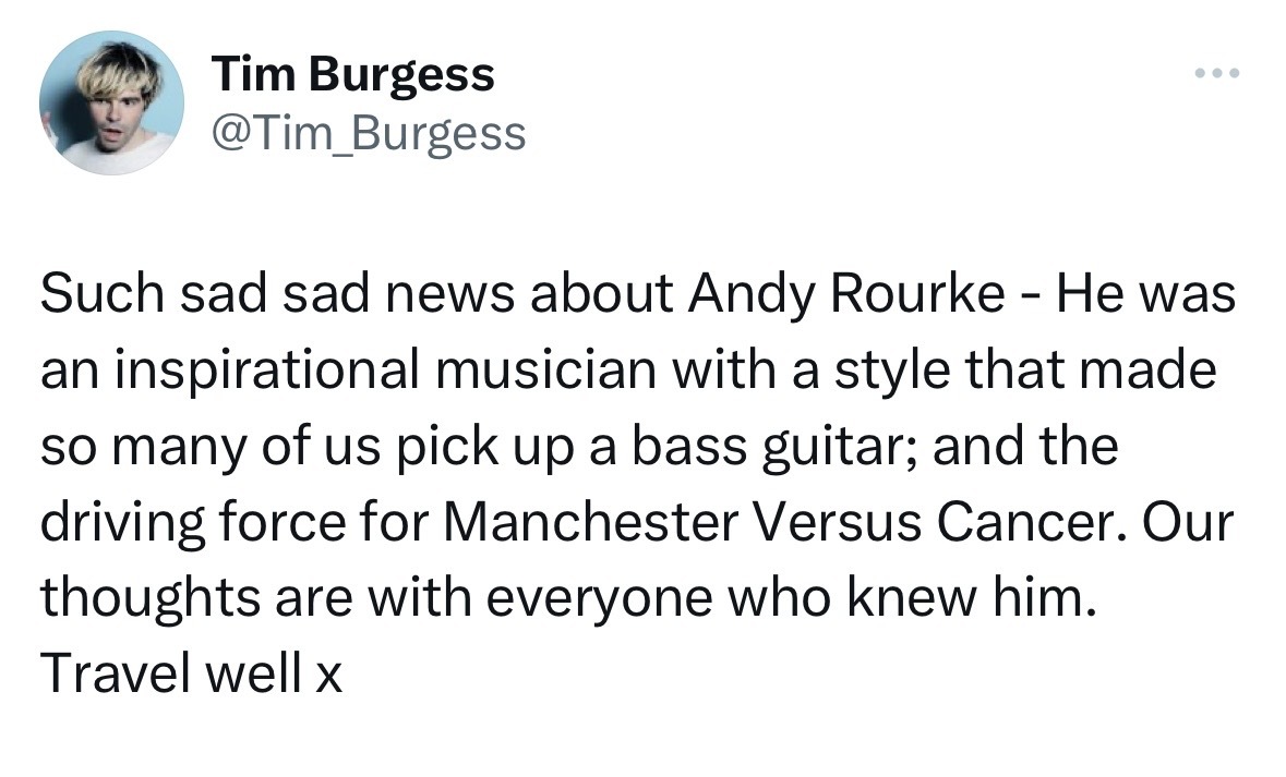 Además de los exintegrantes de The Smiths, como ya lo mencionábamos antes, otras figuras de la música británica reaccionaron y escribieron alguna palabras para Andy Rourke. Uno de los primeros fue Tim Burgess, vocalista de The Charlatans que dijo lo siguiente: “Era un músico inspirador con un estilo que hizo que muchos de nosotros tomáramos un bajo; y la fuerza impulsora de Manchester contra el cáncer. Nuestros pensamientos están con todos los que lo conocieron”.