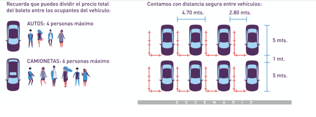 “De la mano de las autoridades, hemos diseñado las instrucciones y los protocolos para recibir al público. De entrada, vamos a tener dos filtros de seguridad: uno donde te lean y escaneen el boleto en tu celular o impreso. En el segundo, se tomará la temperatura, habrá gel disponible, revisarán que todos tengan cubrebocas. En cada concierto, se dirigirá al auto a su espacio; la gente como vaya llegando, irá encontrando su lugar. Los autos van en la parte frontal y las camionetas en la parte posterior”.