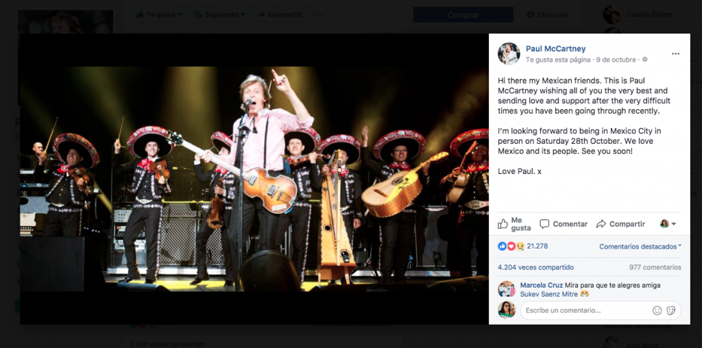Uno de los legendarios integrantes de The Beatles, Paul McCartney, tampoco olvidó a México y, a través de redes sociales, mandó un mensaje de apoyo y solidaridad, e incluso se mostró ansioso por llegar a nuestro país en octubre de 2017, cuando ofrecería un concierto en el Estadio Azteca.