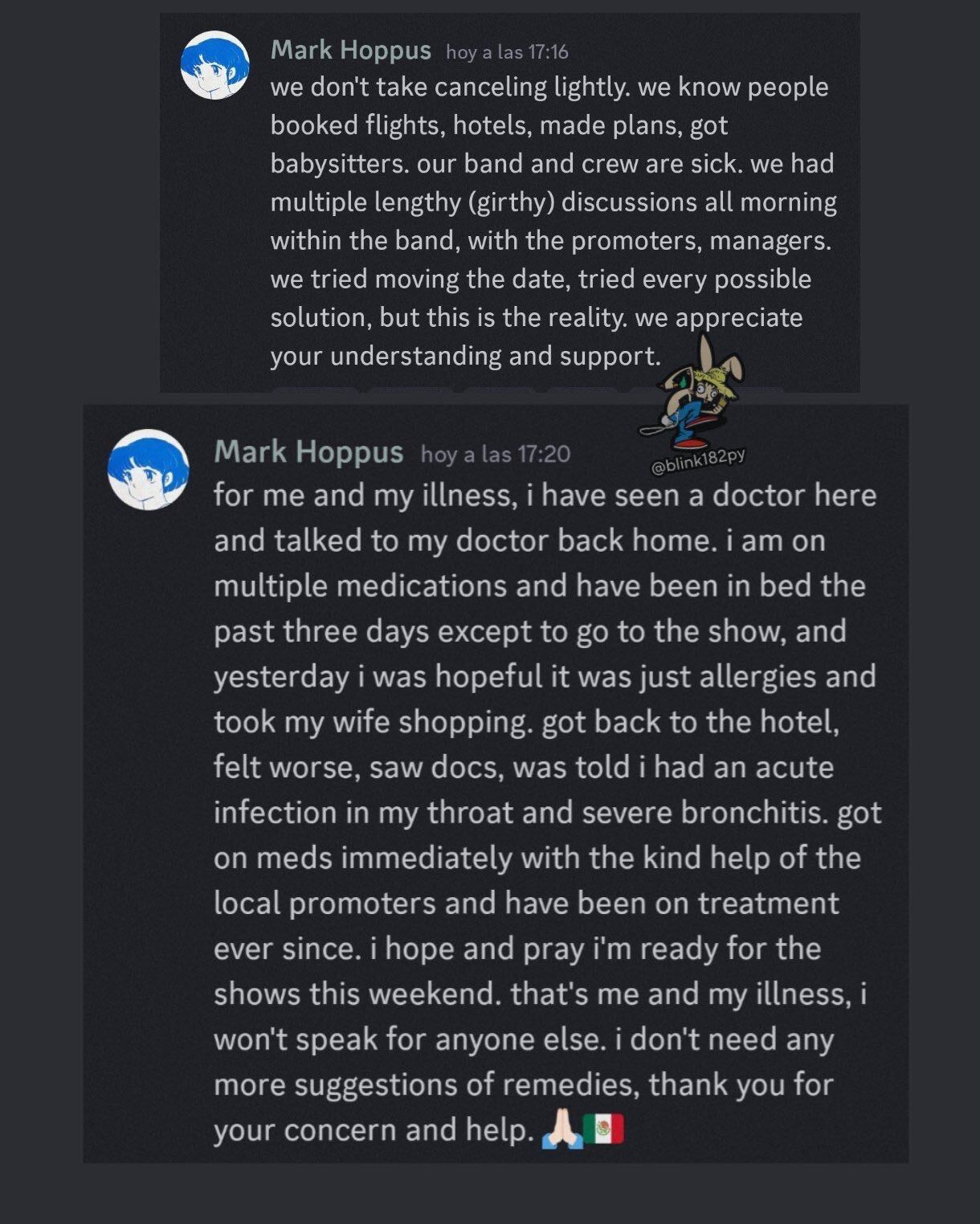 Tras darse a conocer que Blink-182 canceló el concierto mencionado, de nuevo Mark Hoppus se dirigió a su Discord para compartir un mensaje más sobre su condición de salud y el motivo de posponer el show.