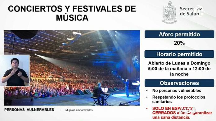 Para que los conciertos en Nuevo León se puedan realizar las promotoras deberán contar solo el 20 por ciento de la capacidad total del aforo en un horario de lunes a domingo de 5:00 de la mañana hasta las 12:00 de la noche. Y sí, debido al riesgo se prohibirá el acceso a población vulnerable como las mujeres embarazadas.