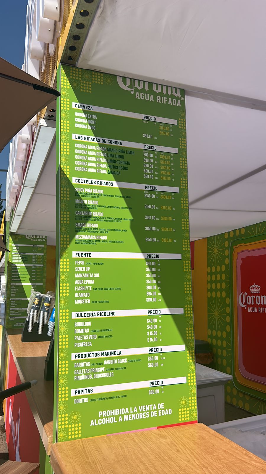 Acá van los precios de las chelas y drinks. Desde la cheve —que ya nos la subieron $30 pesotes a comparación del año pasado— hasta las Vicky, Chivas Regal y Agua Rifada.