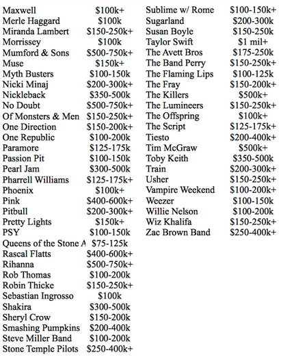 Uno de los pocos grandes misterios que quedan en la industria musical es la cantidad exacta que cobra un artista para venir a tu ciudad y hacer lo suyo. ¿O qué? ¿A poco creías que las bandas tocan de a gratis por aquello del amor al arte? ¡Ja! Claro, hay bandas indie buena onda que estarían más que contentas por venir a tu fiesta privada, con tal de que alguien cubra los costos de transporte, hospedaje y comida… pero dile eso a Katy Perry que te va a pedir medio millón de dólares antes de subirse a un avión. La gran mayoría va exigir un pago por la hora o dos de entretenimiento musical, así como el plomero te cobra por venir a tu casa para arreglar la tubería. El artista tiene derecho a cobrar una cierta cantidad por los servicios de su oficio, según la ley de la oferta y la demanda, pero… ¿cuánto es esa cantidad, precisamente?