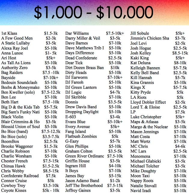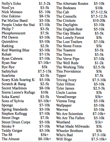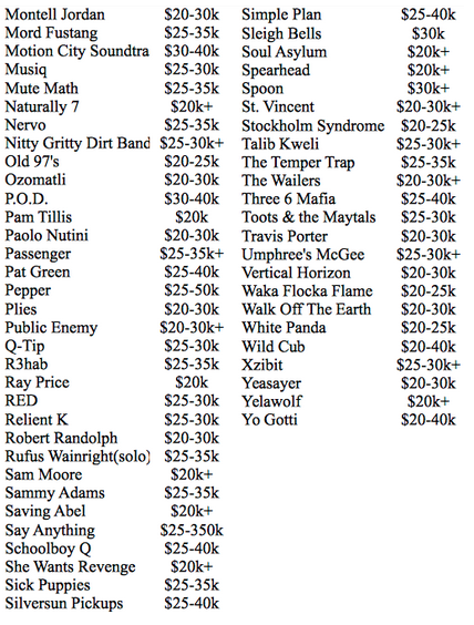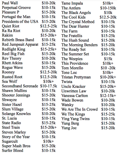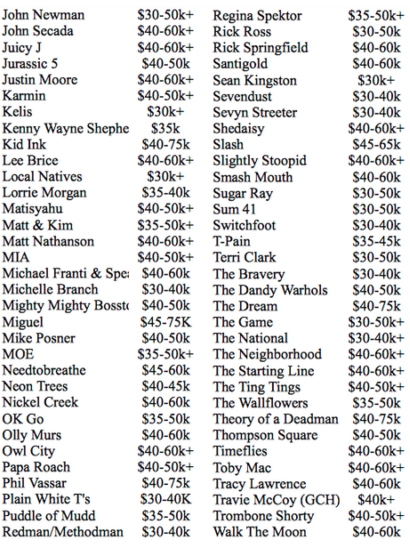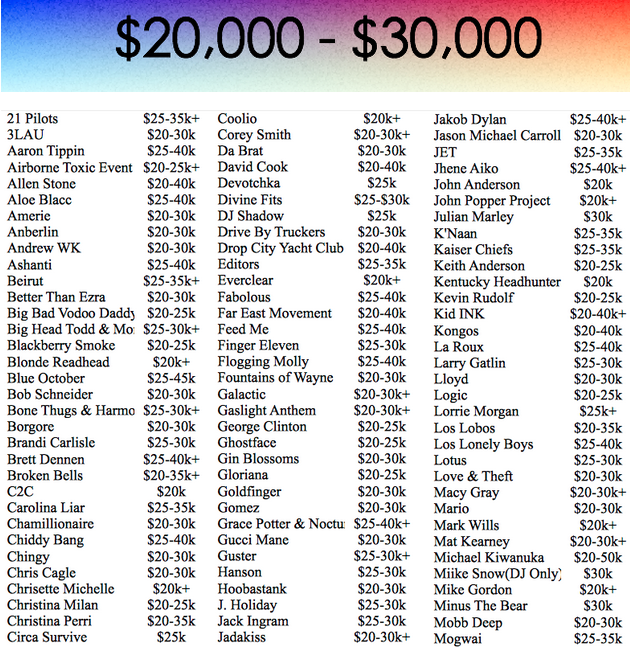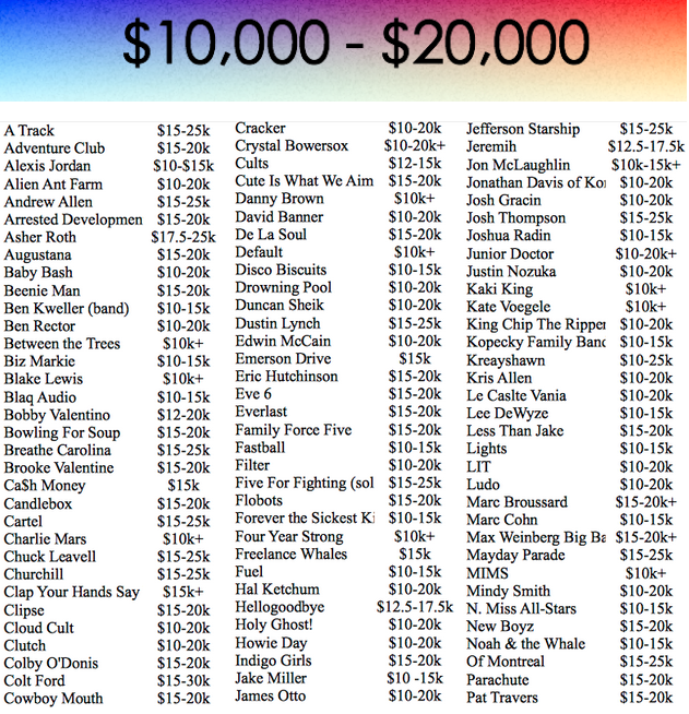 Una agencia de booking llamada Degy Entertainment rompió algún acuerdo tácito de silencio y reveló las tarifas de algunos de los nombres más reconocidos en la industria (antes de todos los gastos). A continuación puedes ver las tablas de precios que van de los mil dólares al millón, aunque claro, estas figuras son las ofertas aproximadas otorgadas a una agencia independiente. La cantidad puede ser muy distinta si la invitación viene de parte de un festival como Coachella, por ejemplo, o después de arduas negociaciones y concesiones y paquetes y etc, etc. Así que no te emociones todavía si tu y tus amigos quieren juntar $10,000 dólares para que Tame Impala toque en tu jardín. Es algo más complicado, pero estos datos sirven para darte una idea de que todavía hay algo de dinero en la industria musical.