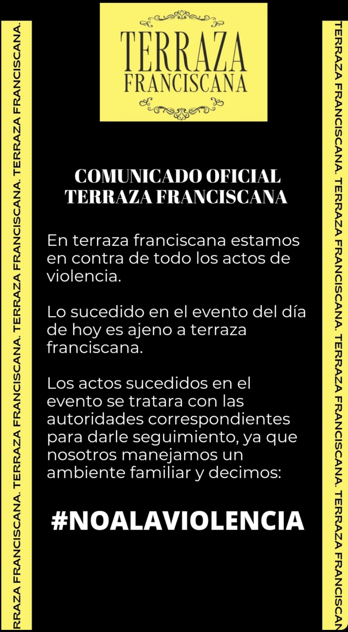 Por supuesto que ante todo lo que pasó en el concierto de Maskatesta, el foro no tardó en dar su punto de vista al respecto. A través de un comunicado, la Terraza Franciscana declaró que están en contra de los actos de violencia, que lo que sucedió en este concierto fue ajeno a ellos y tratarán la situación con las autoridades competentes con el fin de dar con los responsables y que paguen por todo lo que hicieron.