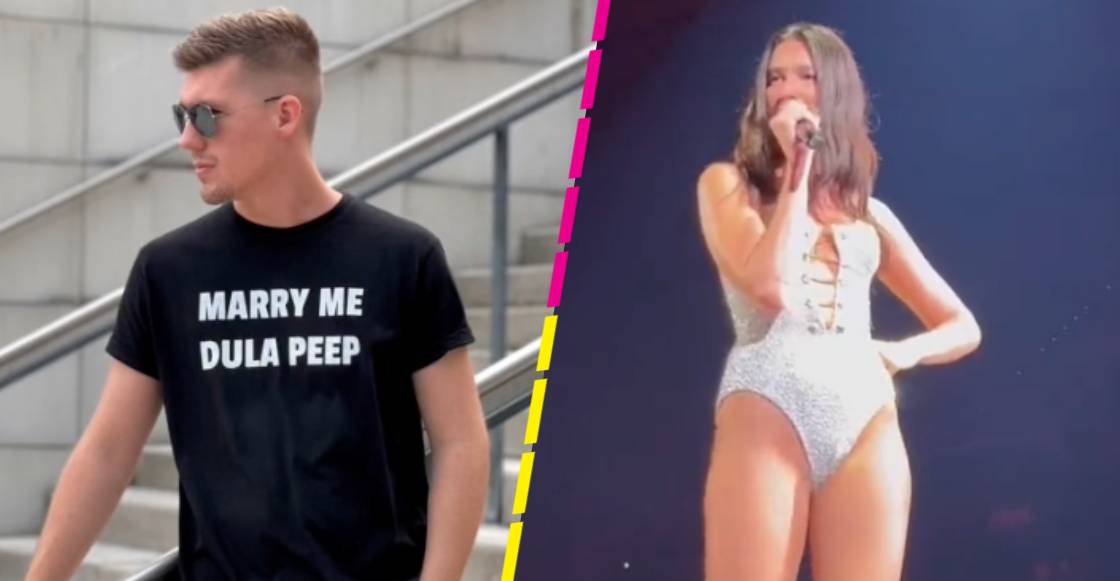 “Tienes una linda playera, ¿qué dice? ¿Cásate conmigo, Dula Peep?” dice la cantante entre una sonrisa. “Desafortunadamente no puedo casarme contigo, pero si gustas puedo dedicarte esta canción”, dice Dua al afortunado sujeto que nomas’ no se la cree. Va el video a continuación: