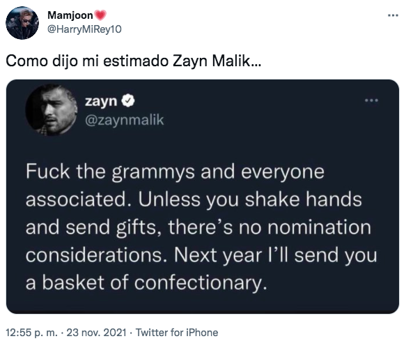 Zayn siempre mereció un Grammy, pero le tienen miedo. pic.twitter.com/DKQweDD3dz