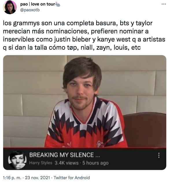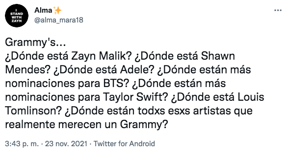 Las fans de BTS también alzaron la voz porque el grupo surcoreano nomás apareció dentro de una de las categorías, a pesar de que su colaboración con Coldplay, “My Universe” (aunque algunos les cueste aceptarlo) es un hitazo a nivel mundial. Mismo caso fue el de Zayn Malyk, quien a inicios de 2021 estrenó su tercer material discográfico como solista, Nobody is Listening, pero ni siquiera le pasó por la mente a los expertos de la Academia de la Grabación. Ahora sí que “hay pa’ la otra”.