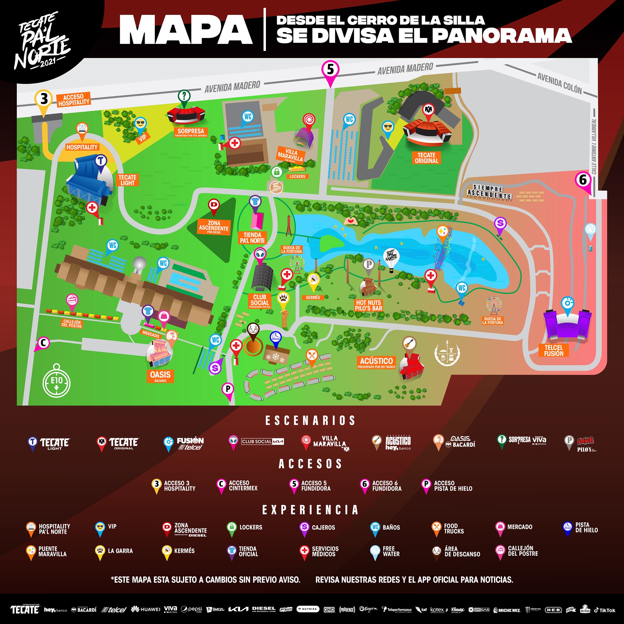 Si es tu primera vez en Tecate Pa’l Norte o ya se te olvidó cómo está la distribución dentro del Parque Fundidora, no te preocupes, que esto lo agradecerás muchísimo. También ya tenemos el mapa para el festival, donde vienen repartidos los nueve escenarios, así como otros lugares muy importantes como los accesos oficiales, los baños, food trucks, los lockers, las zonas VIP y hospitality, cajeros, servicios médicos, área de descanso y hasta la kermés o el mercado, activaciones que incluyeron en los últimos años.