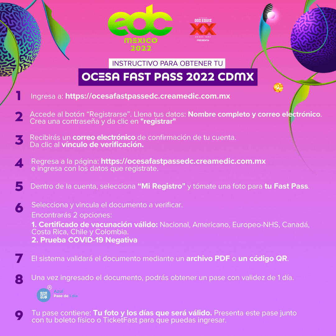 Por supuesto que estamos contentos por el regreso de EDC México, porque la verdad ya extrañamos los festivales. Sin embargo, a pesar de que la situación con el coronavirus ha mejorado y nos permite volver a reunirnos para vivir la música en vivo, es importante mencionar que habrá que tomar medidas para poder entrar a la fiestota este 25, 26 y 27 de febrero. Para empezar, tendrán que presentar su Fast Pass, con el que demuestran que están libres de COVID-19 con su certificado de vacunación o una prueba negativa.