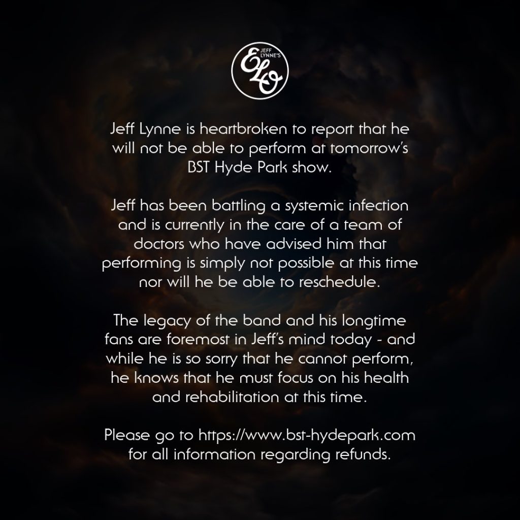 ELO emitió un comunicado para informar sobre la cancelación del concierto en el BST Hyde Park de Londres. De acuerdo con la información de la banda, Jeff Lynne ha estado sufriendo por una infección sistémica.