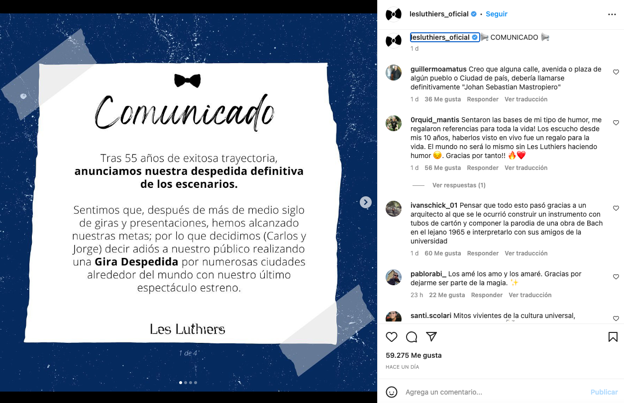 “Sentimos que, después de más de medio siglo de giras y presentaciones, hemos alcanzado nuestras metas“, mencionan. “Este año, cumpliré 77 años y Jorge 75. Nos sentimos muy vitales, y artísticamente creemos estar en nuestro mejor momento; pero a medida que nos acercamos a los 80, nuestros músculos y articulaciones nos anticipan que pronto comenzarán a presentarnos impedimentos“, escribió Carlos López Puccio en una de las cartas del comunicado.