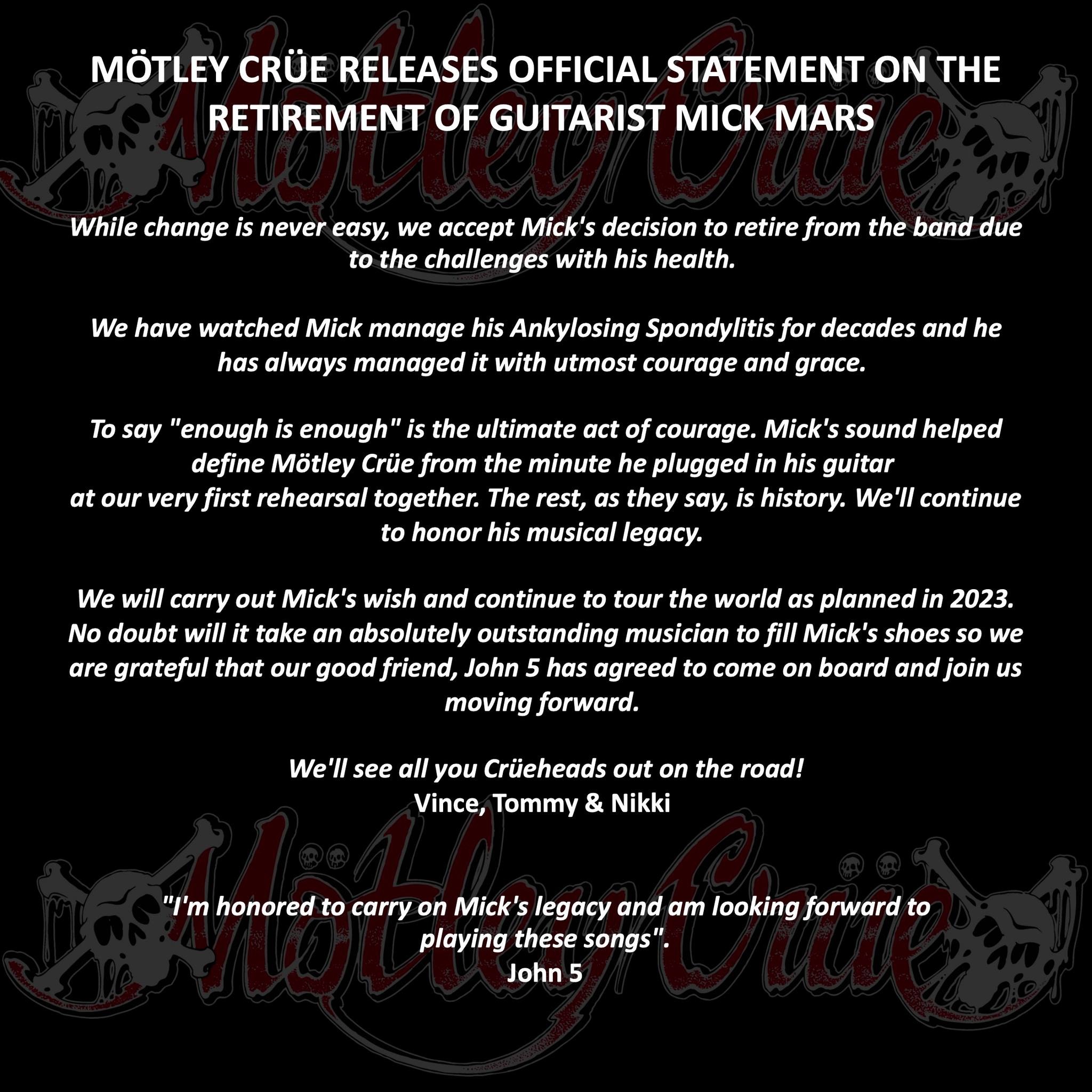 La noticia se reveló por medio de un comunicado de prensa de un representante del guitarrista a través de la revista Variety. Si bien se establece que Mick Mars seguirá formando parte del grupo, se especifica que su padecimiento le impide continuar de gira.