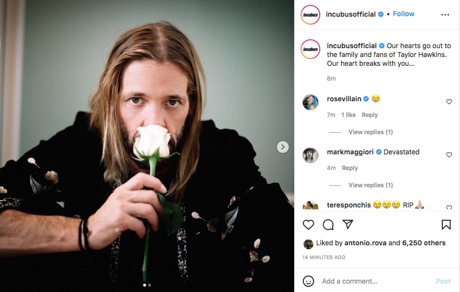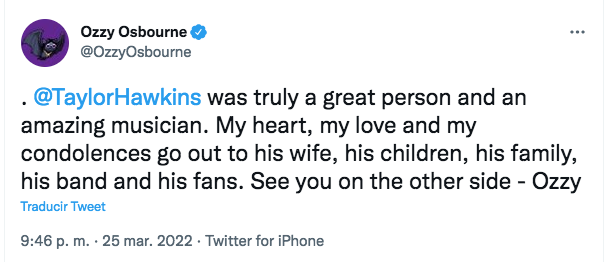 Pero también, cientos de músicos y bandas como Incubus, Ozzy Osbourne, Finneas, Travis Parker, y otros más se han tomado el tiempo de mandar sus condolencias a la banda y dedicar unas palabras a la memoria de Taylor Hawkins.