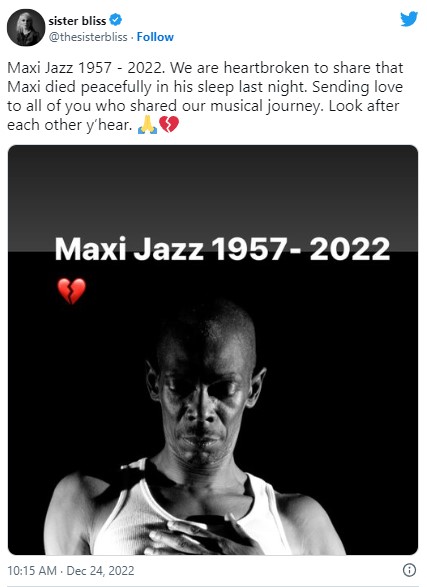 Así lo confirmó Sister Bliss, quien también formara parte de la agrupación. “Estamos desconsolados de compartir que Maxi murió en paz mientras dormía anoche. Enviamos amor a todos los que compartieron nuestro viaje musical… Please look after each other, y’hear (cuídense unos a otros, ¿me oyen?, como él solía decir)“, escribió en Twitter.