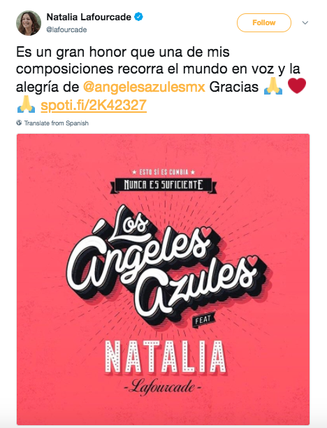 “Es un gran honor que una de mis composiciones recorra el mundo en voz y la alegría de Los Ángeles Azules“, escribió en su cuenta de Twitter la cantante.