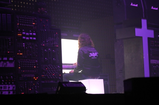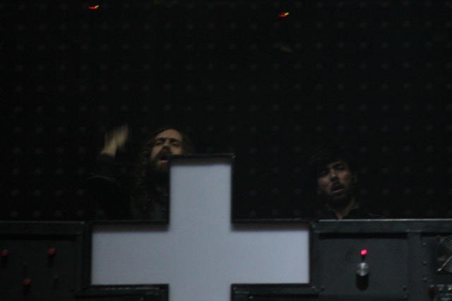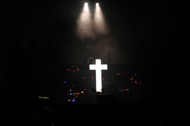 ¡Por fin! La cruz que ha acompañado a este dueto francés dio la cara, junto con todo su montaje que incluía una serie de luces robóticas (rojas), unas tiras de LEDS en forma de circular a su espalda,muchas bocinas y varios cilindros que se asomaron para dar la apariencia de un órgano estilo iglesia, el cual quedaba ad hoc con D.A.N.C.E.