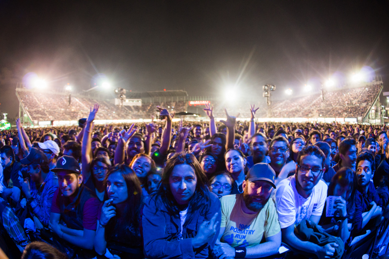 La euforia de la gente era impresionante, coreando ese ya famoso cántico que dice: “olé, olé, olé, olé, Pearl Jam, Pearl Jam”, y en uno de los momentos más emotivos, “Black” se escuchó impresionante, toda la gente la coreó, la voz de Vedder fue sepultada por las miles de voces que cantaban al unísono, gestos que fueron bien correspondidos con un Vedder bajándose del escenario en dos ocasiones para cantarle a la gente de cerca, e intentando hablar en español cada que podía, diciendo frases largas aunque con evidente dificultad. El único detalle es que había momentos en donde no se distinguía lo que cantaba, no sabemos si fue producto de la zona en la que estábamos y el viento, o de plano de un sonido deficiente.