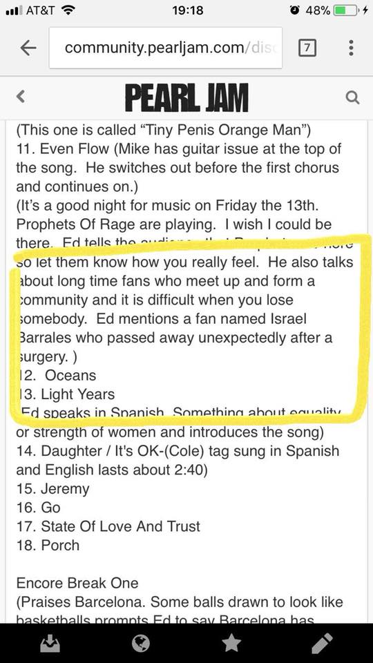 “Pensamos que sería lindo tocar un par de notas para alguien especial esta noche. Él iba a venir a nuestro concierto esta noche, pero lo operaron del corazón hace algunos días, hubo algunas complicaciones y tristemente no sobrevivió; las cosas no salieron bien, así que esta canción es para nuestro hermano Israel”, dijo Eddie Vedder, vocalista de Pearl Jam.