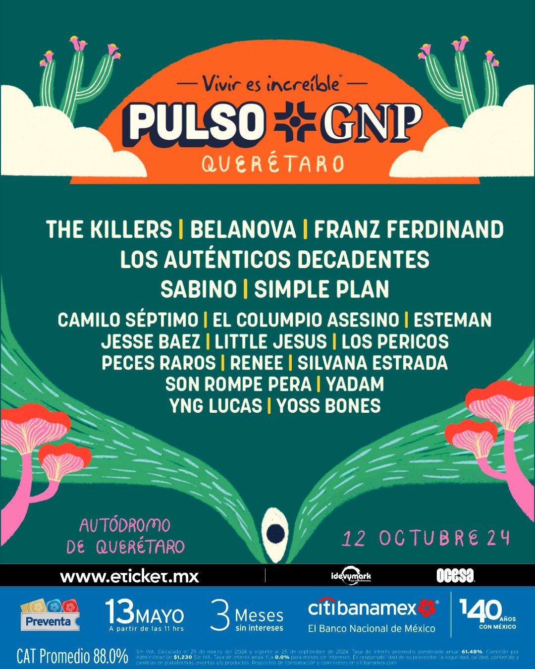 The Killers, Franz Ferdinand, Simple Plan, Belanova, Los Auténticos Decadentes, Silvana Estrada, Little Jesus, Son Rompe Pera, Sabino y Camilo Séptimo son solo algunos de los artistas que encabezarán esta edición del Pulso GNP. A continuación les dejamos el cartel completo para que le echen ojo al talento que se presentará en otoño en Querétaro.