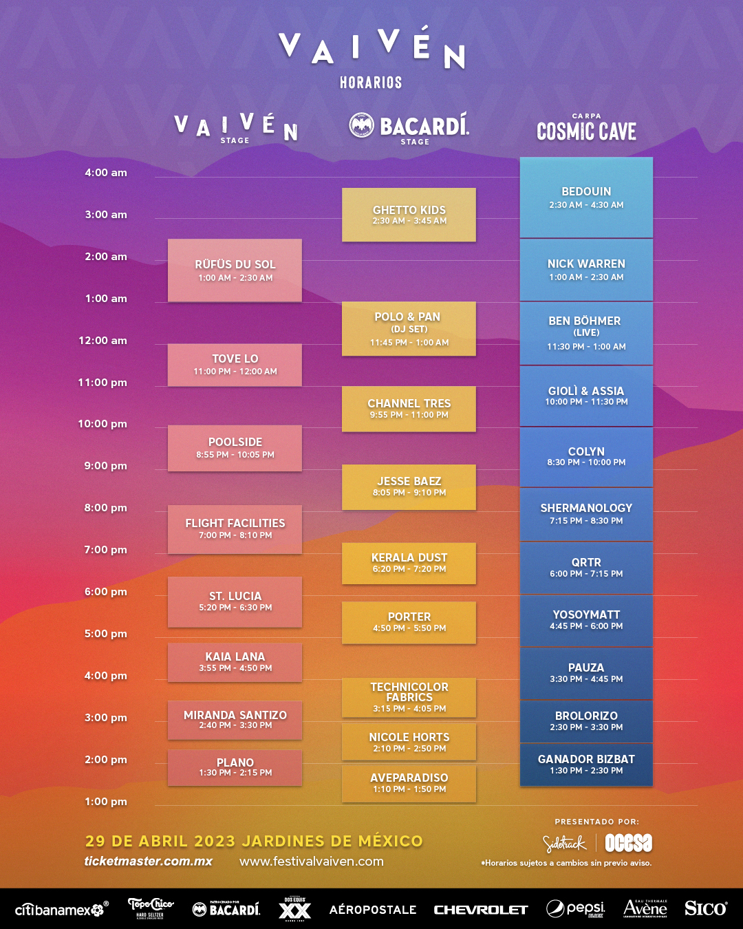 O sea que si vas a ver a Polo & Pan y luego te quieres lanzar a Rüfüs Du Sol, lo ideal es que salgas 5 minutos antes del set del dúo francés. Aquí abajito tienes los horarios y de recomendación, intenta tenerlos siempre en tu cel (tenerlos como fondo de pantalla también es una opción).