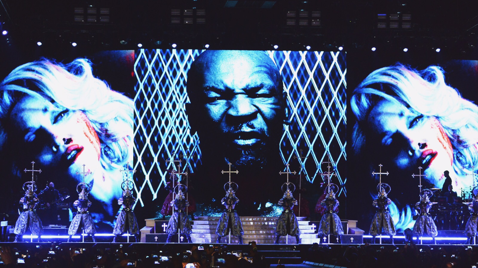 Poco después de las 10 de la noche, el tema “Wanna Be Startin’ Somethin’”, del fallecido Michael Jackson, anunciaba que ya era momento de que comenzará la primera presentación de Madonna en la ciudad, quien acto seguido apareció bajando de una jaula desde las alturas e interpretando el tema “Iconic”, con imágenes del boxeador Mike Tyson en pantalla.
