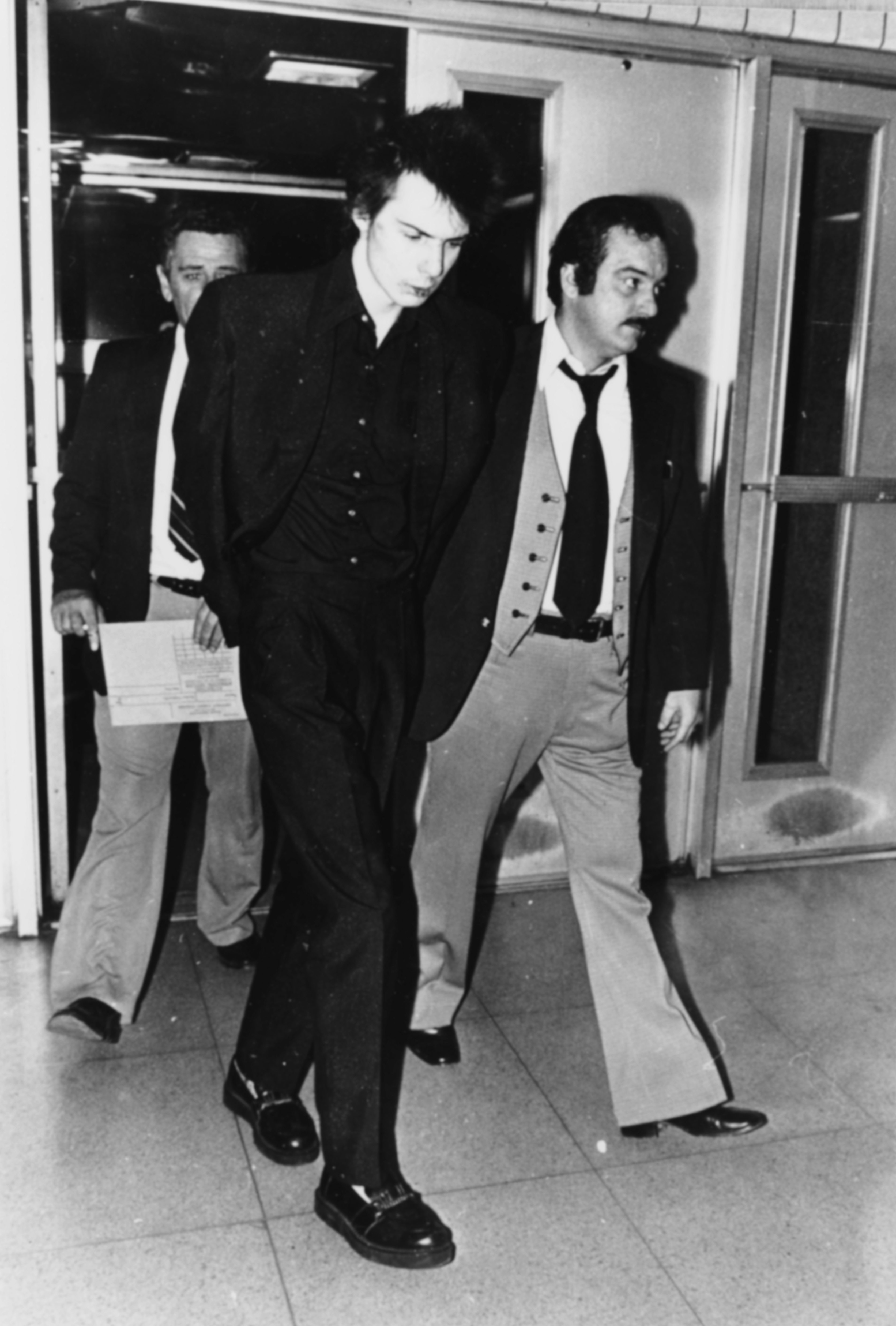 Sid Vicious custodiado por la policía bajo los cargos de asesinato, después de que su novia Nancy fue hallada apuñalada hasta la muerte en un hotel en Nueva York.