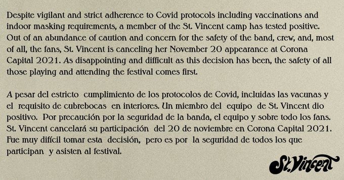 Fue a través de un comunicado, publicado a través de su pagina oficial, donde Annie Clark dió a conocer la noticia sobre su ausencia en el Corona Capital de este año. De acuerdo con lo mencionado por St. Vincent, la razón es porque un miembro de su equipo dio positivo a COVID-19 de manera reciente y a pesar de las precauciones.