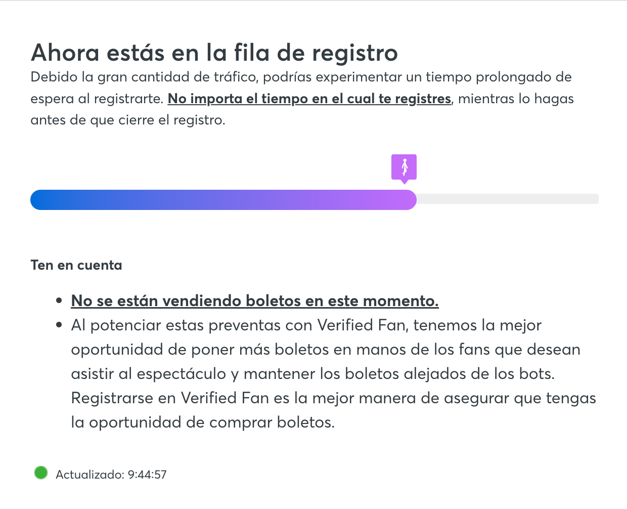 Una vez que esté ahí, harás una fila virtual (aunque todavía no será para comprar nada) para registrarte con tu cuenta de Ticketmaster.