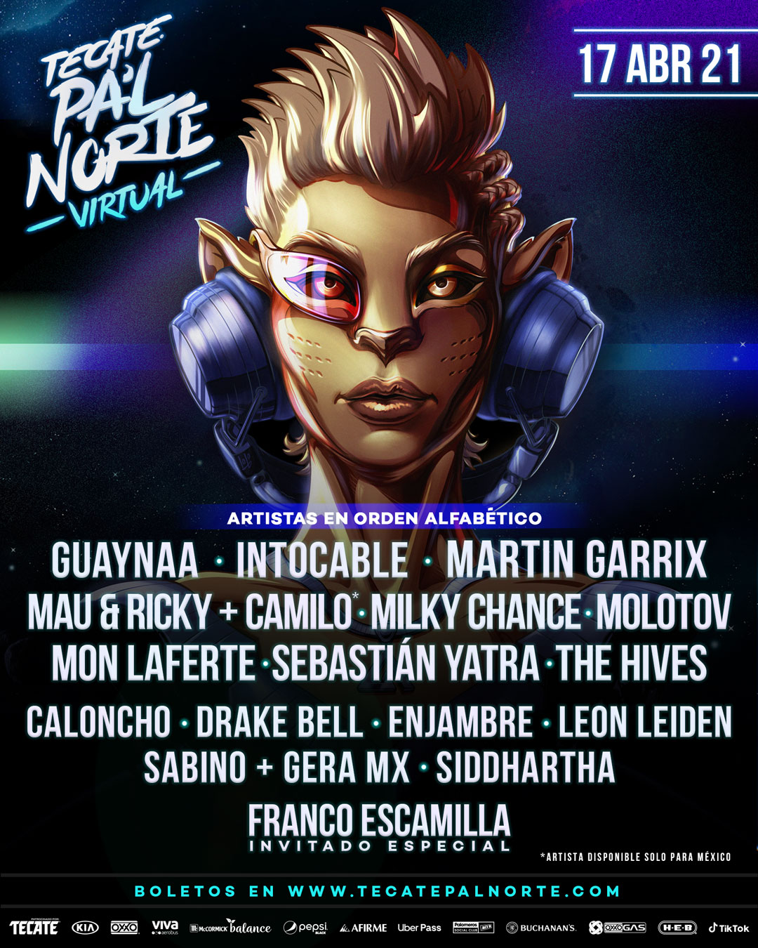 Para Tecate Pa’l Norte Virtual el 17 de abril, los organizadores armaron un lineup que sin duda veríamos en la edición presencial, con talento nacional, de Latinoamérica y por supuesto, de otras partes del mundo. Serán 18 los artistas encargados de hacer vibrar los tres escenarios principales, que tienen todo el estilo y la esencia del festival, y que seguramente disfrutarás como nunca en tu sala.