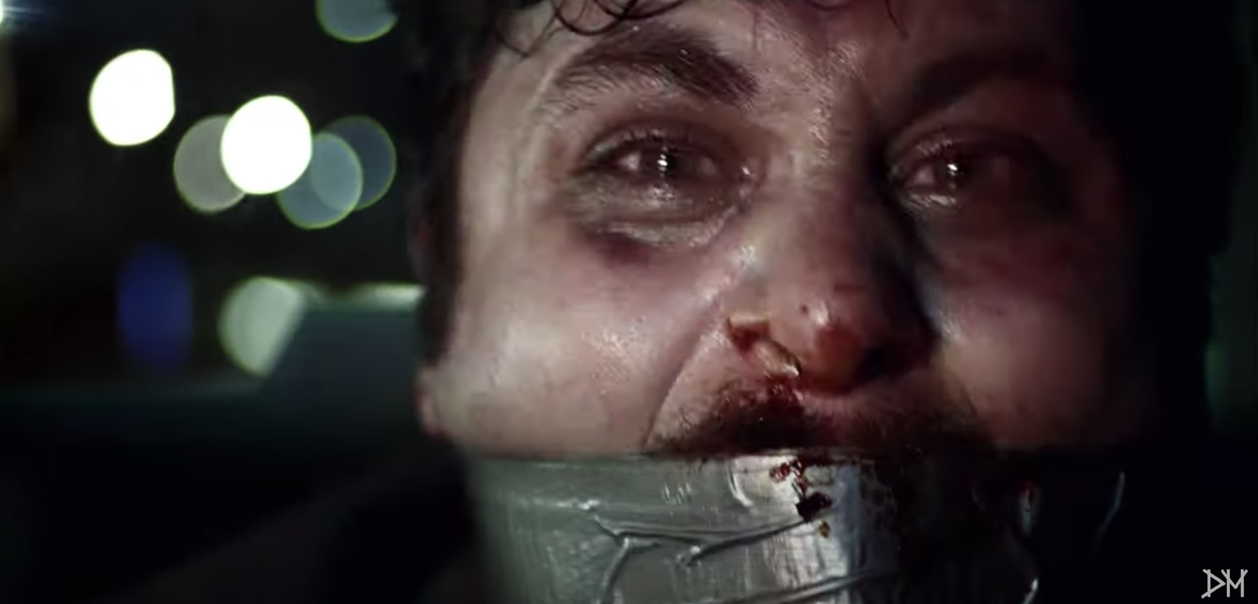 El hombre intenta desatarse y se quita la máscara. Pronto tiene éxito y podemos ver su rostro: la boca todavía está envuelta en cinta adhesiva, de donde sale sangre.