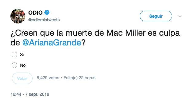 Sin embargo, lo que es real es lo que está circulando en internet. Lo que la gente dice. Unos dicen que “hay amores que matan”, otros dicen que “ya están hasta los cojones de que Ariana Grande tenga la culpa de todo”. También hay gente que critica que los encabezados mencionen a Mac Miller como “el ex novio de Ariana Grande” o que les parece “lamentable que haya gente que defienda a Ariana Grande cuando no cabe ninguna duda de que ella es la culpable”.