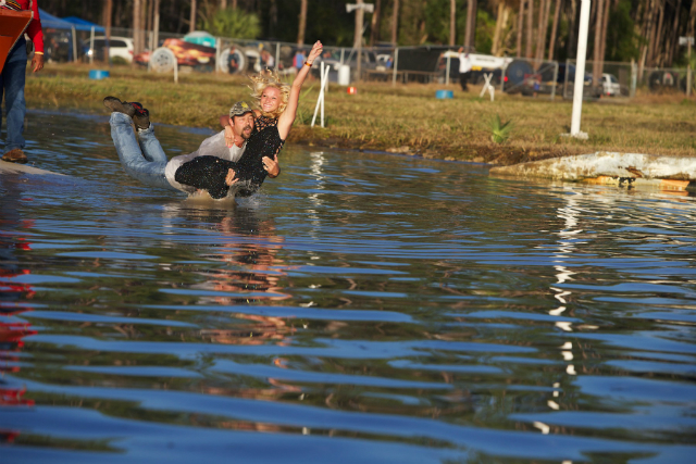 Los participantes se arrojan hacia el agua de la Bahía Vizcaína, ubicada en Florida. Lo interesante es ver los diseños todos locochones de las personas.