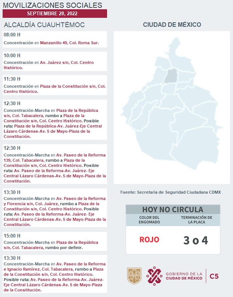 El mismísimo C5 (Centro de Comando, Control, Cómputo, Comunicaciones y Contacto Ciudadano) trae toda la info sobre las movilizaciones en este 28S.