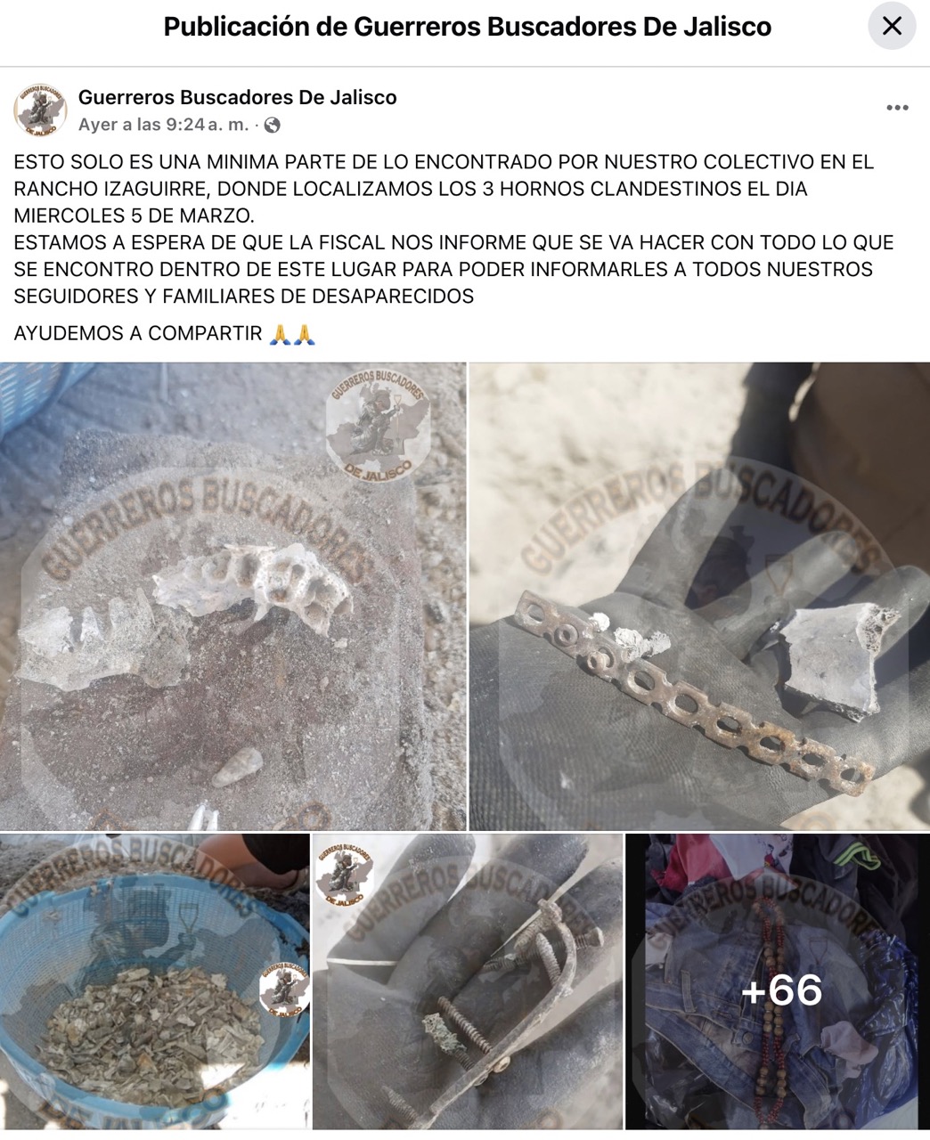 El grupo de Guerreros Buscadores de Jalisco localizó el miércoles 5 de marzo del 2025, un rancho en Teuchitlán, con tres hornos clandestinos, restos de huesos y un gran número de pertenencias.
