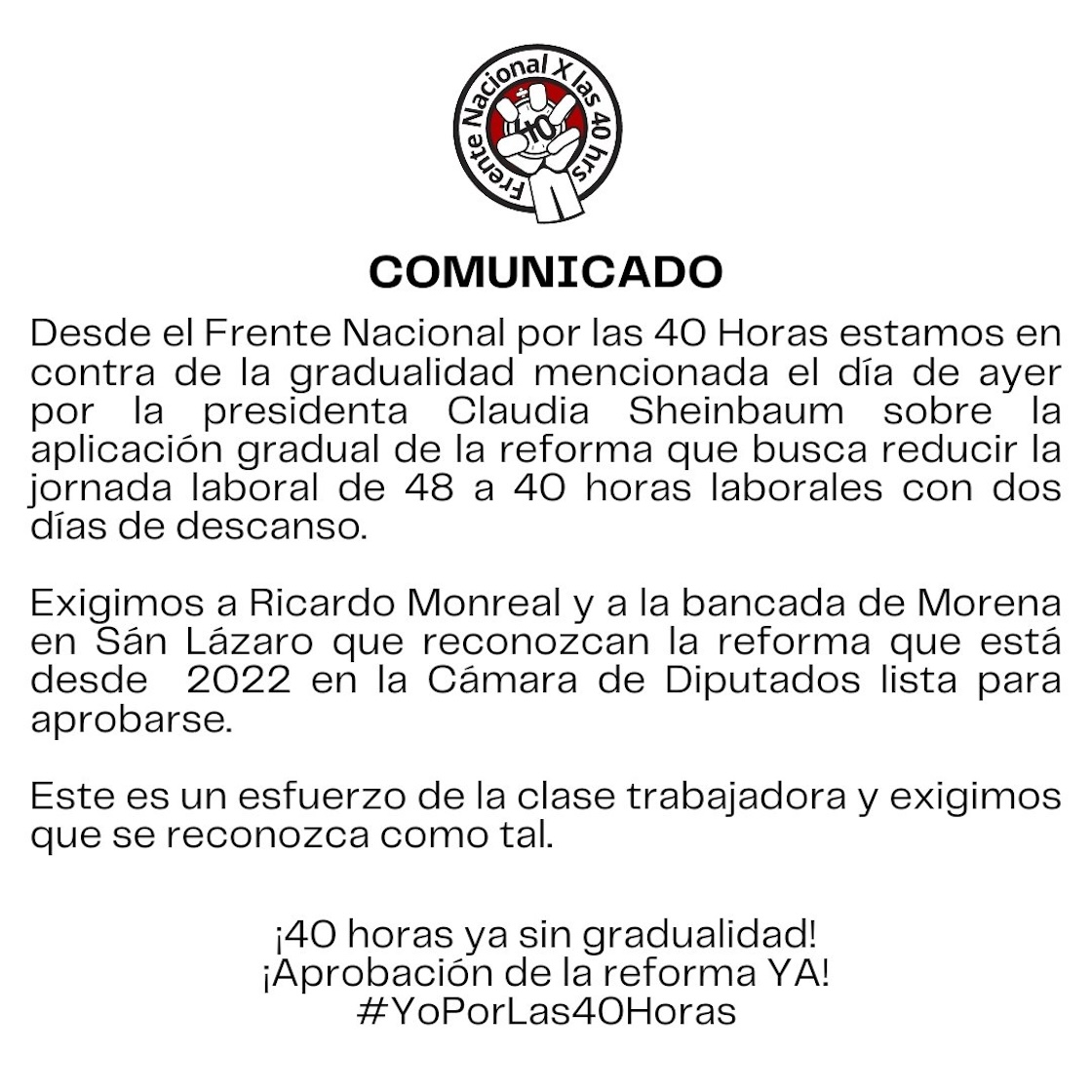 Desde su cuenta de Twitter o X —como prefieran decirle—, el Frente Nacional por las 40 horas rechazó la propuesta de Claudia Sheinbaum.