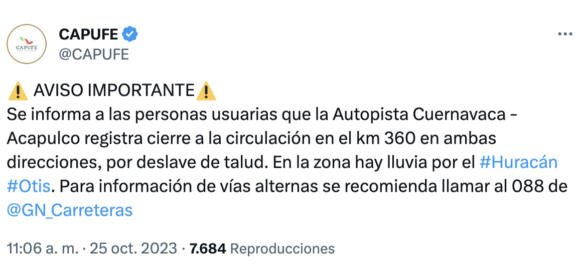 La madrugada de este 25 de octubre el huracán Otis, categoría 5, tocó tierra en las inmediaciones de Acapulco. Debido a derrumbes y deslaves, la Autopista del Sol y la carretera federal Chilpancingo-Acapulco están bloqueadas.