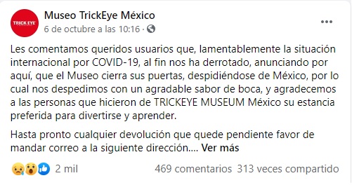 Preparen los pañuelos desechables, que hay una víctima más del COVID-19. Después de siete meses sin actividad y sin ingreso alguno, ‘Trick Eye’, el único museo que en su totalidad es en 3D y de realidad virtual en México y el más grande de Latinoamérica, se vio obligado a cerrar sus puertas definitivamente. Con tan solo dos años de vida, lamentablemente se suma a la decena de negocios que no ha podido sobrevivir a los efectos de la pandemia.
