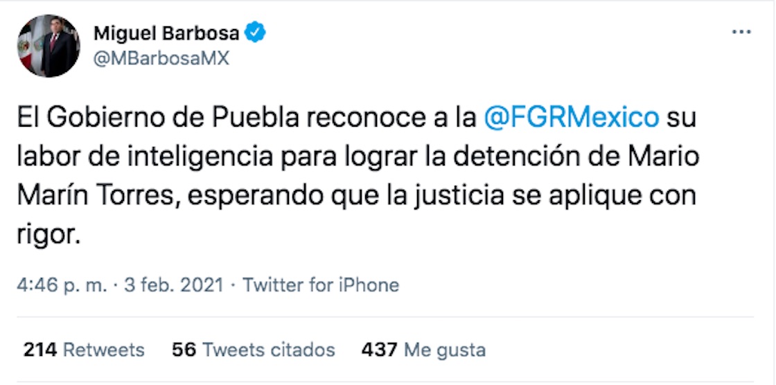 “El Gobierno de Puebla reconoce a la FGR su labor de inteligencia para lograr la detención de Mario Marín Torres, esperando que la justicia se aplique con rigor”, escribió el actual gobernador de Puebla en sus redes sociales.