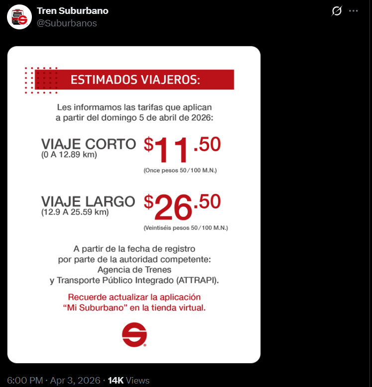 Eso sí, la empresa Ferrocarriles Suburbanos afirmó que el costo de la tarjeta de acceso se seguirá manteniendo en $18.00 pesos.
