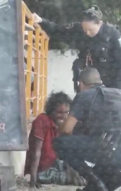Como podrás ver en el video que se compartió en redes sociales, los policías parecen preguntarle algo al hombre en situación de calle. El problema es que lo hacen mientras la mujer le pisa una pierna, a la altura de la rodilla.