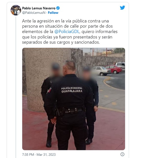“Ante la agresión en la vía pública contra una persona en situación de calle por parte de dos elementos de la Policía de Guadalajara, quiero informarles que los policías ya fueron presentados y serán separados de sus cargos y sancionados“, aseguró en su cuenta de Twitter.